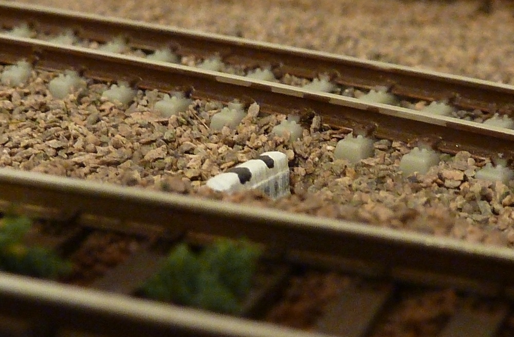 A také jsem začal s patinou štěrkového podloží. Vzal jsem olejovku Umbru pálenou, naředil normálním S6006 do kapalné konzistence a štětečkem nanášel na podloží. Po chvilce mě to ale přestalo bavit, protože ředidlo hrozně rychle vyprchalo, takže jsem Umbru neředil tolik, jenom tak 1:1, a potom ji tupoval. Bílých teček si nevšímejte, jsou to jen zbytky vyprsklé sádry. Na výhybce č. 2 jsem Hliníkem nabarvil srdcovku, aby tolik nekřičel černý plast- to samozřejmě udělám i na těch ostatních.