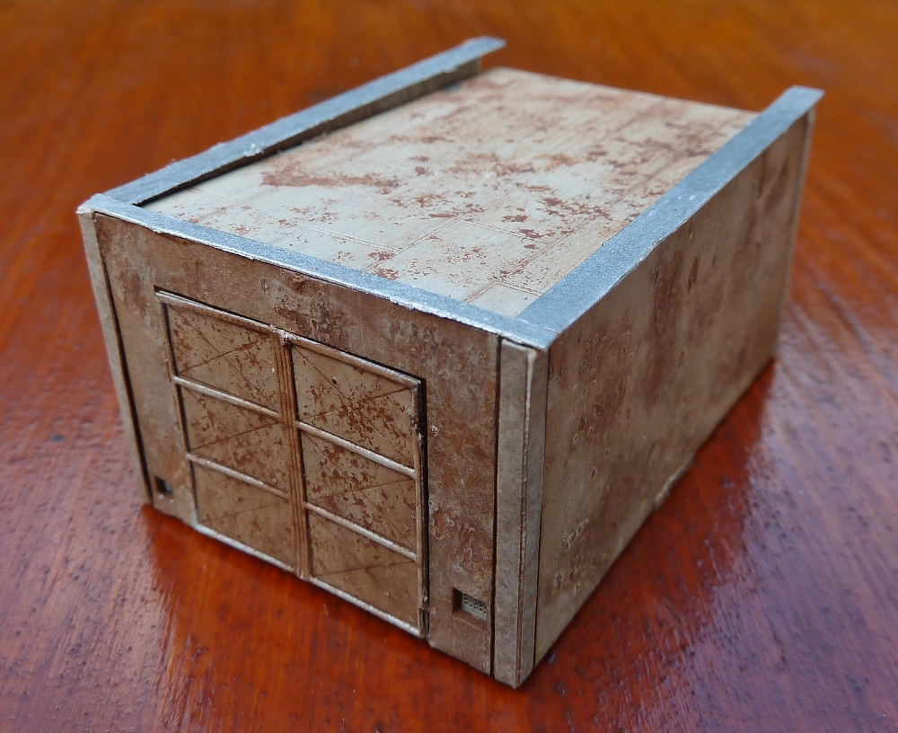 Účelem bylo vytvořit pořádně orezlou a plesnivou, dávno nepoužívanou garáž, takže jsem si mohl vyzkoušet nové metody patiny, třeba tzv. solnou patinu, kdy se na povrch předtím natřený na rez nanesou zrníčka soli a to celé se následně přestříká barvou, nakonec se sůl sloupne a zůstanou nám rezavé flíčky velikosti jednoho zrna soli. Nakonec jsem to celé doladil tupováním lihovky Rez kouskem molitanu.