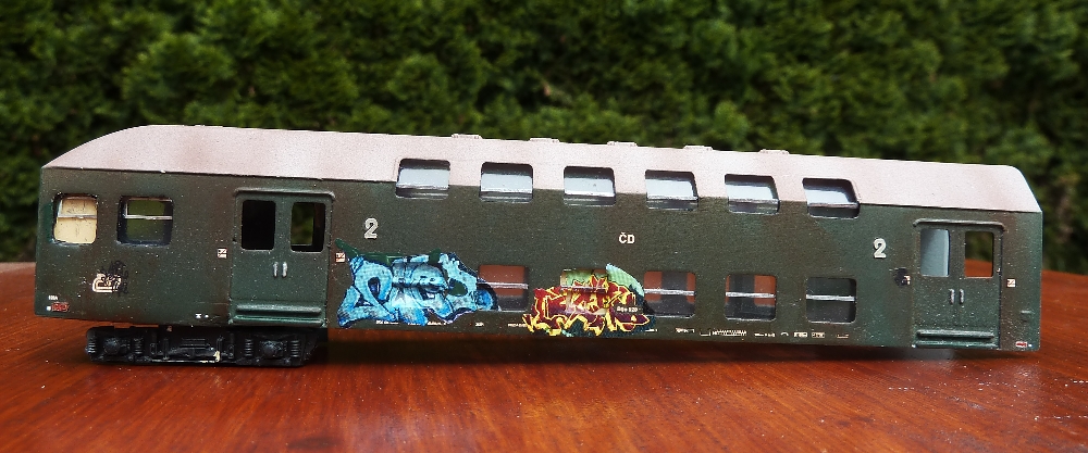 Na co jsem se dlouho těšil, byly obtisky grafitti od Rosťopiše. Tyhle jednotky ke konci provozu jezdily značně posprejované, na druhou stranu by byla škoda ničit takhle model celý, takže jsem je nanesl jen na jednu stranu. Krajní části krajních článků měli podle dobových fotek sprejeři nejradši, tam jsem tedy nanesl největší obtisk.